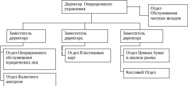 2. Управленческая деятельность в Операционном управлении центрального аппарата Сбербанка России. Операционное Управление Сбербанка России (Управление) является структурным подразделением центрального аппарата Сбербанка России. Задачами Управления являются1: 1. Эффективное осуществление основных видов деятельности Управления, а именно: организация обслуживания юридических и физических лиц (резидентов и нерезидентов) в Центральном аппарате; Привлечение финансовых ресурсов за счет развития клиентской базы; 2. Обеспечение увеличения доходов и снижения расходов Банка (его структурных подразделений), по основным видам деятельности Управления; 3. Развитие направлений деятельности Банка, входящих в компетенцию Управления. Управление в соответствии с возложенными на него задачами выполняет следующие функции: осуществляет расчетно-кассовое обслуживание физических и юридических лиц, в том числе бюджетов; привлекает на договорных условиях денежные средства юридических и физических лиц в рублях и иностранной валюте; осуществляет операции кредитования физических лиц, в том числе овердрафтного кредитования по счетам банковских карт, в установленном Банком порядке; принимает на инкассо векселя, платежные и расчетные документы в рублях и иностранной валюте; совершает операции по купле-продаже иностранной валюты в наличной и безналичной формах, в том числе за счет и по поручению клиентов, а также дорожных чеков; проводит документарные операции по поручению клиентов; осуществляет операции с драгоценными металлами и монетами из драгоценных металлов в установленном Банком порядке; предоставляет в аренду индивидуальные сейфы физическим и юридическим лицам; осуществляет выдачу и обслуживание пластиковых карточек, развивает совместно с другими управлениями Банка сеть банкоматов и терминалов в торговых и сервисных предприятиях; проводит операции с векселями в рублях и иностранной валюте в установленном Банком порядке на договорной основе по поручению и за счет средств юридических и физических лиц проводит операции с ценными бумагами; в пределах установленных лимитов и в установленном Банком порядке проводит операции с ценными бумагами за счет средств Банка; другие функции. Взаимосвязи Операционного Управления с другими подразделениями. Управление организует работу, исходя из возложенных на него задач и выполняемых функций в соответствии с перспективными и текущими планами работы. Управление координирует свою деятельность с другими подразделениями Банка в целях соблюдения интересов Банка. Управление в пределах своей компетенции направляет обязательные для исполнения учреждениями Банка указания и разъяснения. Управление принимает участие в разработке нормативных и распорядительных документов Банка. Отдел Операционного обслуживания участвует в подготовке и выполнении показателей бизнес-плана Банка по направлениям деятельности Отдела. Инициирует разработку и участвует в создании и внедрении в практику новых банковских продуктов, услуг, технологий. Обеспечивает своевременную подготовку и передачу периодической отчетности, закрепленной за Управлением. Организационная структура Операционного управления Управление возглавляет директор, который назначается на должность и освобождается от должности при