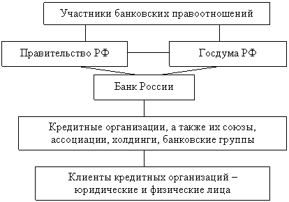 Рисунок 5.2 - Банковские правоотношения В целом российская банковская система структурно аналогична банковским системам других стран. Она имеет два уровня, ведущую роль в ней играет центральный банк, который является важнейшим участником и регулятором экономических и финансовых отношений. 5.2 Задачи и функции Центрального банка в области банковского регулирования и надзора В соответствии со ст. 56 Федерального закона «О Центральном банке Российской Федерации (Банке России)» Банк России является органом банковского регулирования и банковского надзора. Банк России осуществляет постоянный надзор за соблюдением кредитными организациями и банковскими группами банковского законодательства, нормативных актов Банка России, установленных ими обязательных нормативов. Главными целями банковского регулирования и банковского надзора являются поддержание стабильности банковской системы Российской Федерации и защита интересов вкладчиков и кредиторов. При этом Банк России не вмешивается в оперативную деятельность кредитных организаций, за исключением случаев, предусмотренных федеральными законами. Банк России осуществляет регулирование и надзор за деятельностью кредитных организаций с использованием нескольких методов. 1. Регулирование допуска на рынок банковских услуг. Банк России, принимая решение о допуске на рынок банковских услуг, о государственной регистрации новых кредитных организаций и выдаче им лицензий на осуществление банковских операций, осуществляет контроль за соблюдением требований, установленных банковским законодательством и нормативными актами Банка России: · по обеспечению минимального размера уставного капитала вновь создаваемой кредитной организации; · по формированию уставного капитала кредитной организации собственными денежными средствами инвесторов; · по соблюдению установленного предельного размера оплаты уставного капитала в неденежной форме в случае внесения определенных видов имущества (здания, помещения); · по обеспечению прозрачности структуры собственности кредитных организаций; · по финансовому положению учредителей (участников) кредитной организации; · по соответствию кандидатов на должности членов совета директоров (наблюдательного совета), единоличного исполнительного органа, его заместителей, членов коллегиального исполнительного органа, главного бухгалтера кредитной организации и его заместителей установленным Банком России квалификационным требованиям и требованиям к их деловой репутации, позволяющим занимать соответствующую должность в органах управления кредитной организации. 2. Дистанционный надзор. Действия Банка России в области дистанционного надзора направлены на реализацию проактивной функции банковского надзора и включают совершенствование компоненты системы раннего предупреждения, базирующейся на данных документарного анализа, формирование подходов к надзору на консолидированной основе, развитие подходов к оценке рисков и финансовой устойчивости кредитных организаций и оптимального режима банковского надзора. В сфере методологии и организации текущего надзора Банк России продолжает приведение действующей системы регулирования деятельности банков в соответствие с принятыми в международной практике подходами, ориентируясь, пр