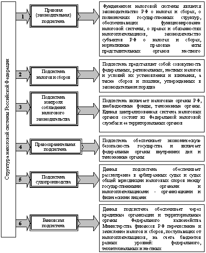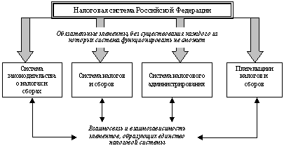 <!--[if mso &amp;amp;amp;amp; !supportInlineShapes &amp;amp;amp;amp; supportFields]> <![endif]--> Рисунок 6.2 - Система налогов и сборов Российской Федерации Налоговую систему можно определить как целостное единство четырех основных ее элементов : системы законодательства о налогах и сборах, системы налогов и сборов, плательщиков налогов и сборов и системы налогового администрирования, каждый из которых при этом находится друг с другом в тесной взаимосвязи и взаимозависимости. На рис. 6.3 представлен состав обязательных элементов налоговой системы Российской Федерации.