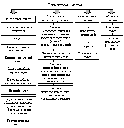 Рисунок 6.1 - Структура налоговой системы Российской Федерации В настоящее время налоговой системе Российской Федерации соответствуют следующие организационные принципы: · принцип единства - Правительство РФ обеспечивает проведение единой финансовой, кредитной и денежнойполитики; · принцип подвижности (пластичности) предполагает, что налог и некоторые налоговые механизмы могут быть оперативно изменены в сторону уменьшения или увеличения налогового бремени в соответствии с объективной необходимостью и возможностями государства; · принцип множественности налогов включает несколько аспектов, важнейший из которых устанавливает следующее: налоговая система государства должна быть основана на совокупности дифференцированных налогов и объектов обложения. Комбинации различных налогов и облагаемых объектов должны образовывать такую систему, которая соответствовала бы требованию перераспределения налогового бремени по плательщикам; · принцип стабильности предусматривает, что налоговая система должна действовать в течение ряда лет вплоть до налоговой реформы; · принцип исчерпывающего перечня налогов заключается в следующем: единое экономическое пространство РФ обусловливает политику государства на унификацию налоговых платежей. Этой цели служит принцип исчерпывающего перечня региональных и местных налогов, которые могут устанавливаться органами государственной власти субъектов РФ и органами местного самоуправления. В соответствии со ст. 13-15 НК все налоги и сборы РФ делятся на три вида : · федеральные налоги и сборы; · региональные налоги; · местные налоги. Основное разграничение этих видов налогов и сборов заключается не в уровне бюджета, в который они зачисляются, а в том, каким уровнем управления они устанавливаются и на какой территории они обязательны к уплате. Так, в соответствии со ст. 12 НК: · федеральные налоги и сборы устанавливаются НК и обязательны к уплате на всей территории РФ; · региональные налоги устанавливаются НК и вводятся в действие законами субъектов РФ и обязательны к уплате на территории соответствующих субъектов РФ; · местные налоги устанавливаются НК и вводятся в действие нормативными правовыми актами представительных органов местного самоуправления и обязательны к уплате на территории соответствующих муниципальных. На рис. 6.2 представлена система налогов и сборов Российской Федерации. <!--[if mso &amp;amp;amp;amp; !supportInlineShapes &amp;amp;amp;amp; supportFields]> SHAPE \* MERGEFORMAT <![endif]-->