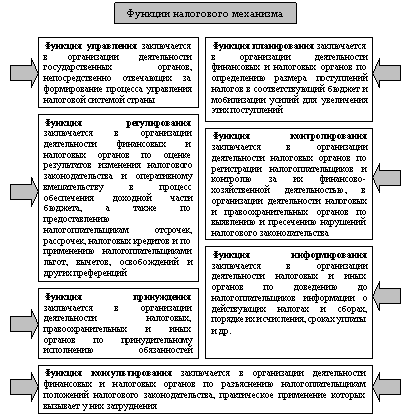 Рисунок 6.5 - Взаимосвязь налоговой политики и налогового механизма РФ Налоговый механизм представляет собой систему правовых норм и организационных мер, определяющих порядок управления налоговой системой страны и ее функционирования. Фундаментом для построения налогового механизма является налоговое законодательство, устанавливающее конкретные субъекты, ответственные за реализацию функций управления налоговой системой страны, саму совокупность налогов и сборов, субъектный состав налоговых правоотношений, конкретные алгоритмы реализации функций этого механизма. Данные функции и их содержание обуславливаются сущностью и функциями самих налогов, они ориентированы на обеспечение эффективного функционирования налоговой системы. Для налогового механизма нашей страны характерны функции, представленные на рис. 6.6. <!--[if mso &amp;amp; !supportInlineShapes &amp;amp; supportFields]> SHAPE \* MERGEFORMAT <![endif]-->