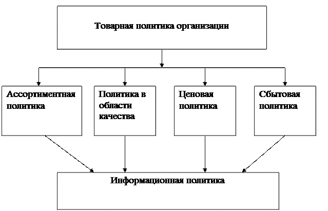 Рис. 2.С оставные элементы товарной политики предприятия Источник: [29] Товарная политика определяется на стадии разработки стратегии организации, а маркетинговые операции являются частью стратегии маркетинга, его тактикой. Товарная политика – это комплексное понятие, включающее в себя ассортиментную политику, сервисную политику, создание новых товаров и запуск их в производство, исключение из планов товаров, потерявших потребительский спрос, модификацию товаров, вопросы упаковки, товарного знака и наименование товара. Товарная политика – это определенный курс действий товаропроизводителя, призванный обеспечить преемственность решений и мер по формированию ассортимента и управления им, по поддержанию конкурентоспособности товара на требуемом уровне, нахождению для товара оптимальных рыночных ниш, и ниш, разработки и реализации стратегий упаковки, маркировки и сервиса товара. Важно отметить, что ассортиментная политика является более узким понятием и представляет собой часть «товарной политики» (рисунок 3). Это утверждение можно обосновать, основываясь на работах ученых П.С.Завьялова[22] и Л.М.Путятиной[30].