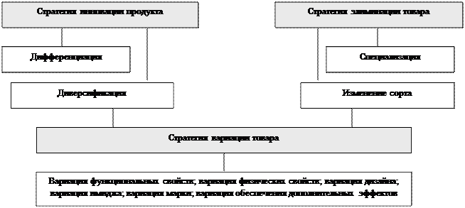 Источник: [18, стр23- 25] Стратегия вариации ассортимента товарного ассортимента нацеливает предприятие на усовершенствование по различным технико-экономическим, маркетинговым и иным параметрам уже выпускаемых видов продукции. К стратегии вариации товара можно отнести: Вариация функциональных свойств; вариация физических свойств; вариация дизайна; вариация имиджа; вариация марки; вариация обеспечения дополнительных эффектов. Представленные варианты стратегических ассортиментных решений должныразрабатываться на основе ключевых теорий эффективности и теории выбора, а так же носнове принципов и методов системного моделирования. Данное утверждение должно послужить приоритетным ориентиром в определении направлений оптимизации ассортиментных усилий. [18,С.26] Предметом вариации товара могут быть один или несколько следующих элементов товара: физические и функциональные свойства (например, вид материала, техническая конструкция, качество оснастки, сохраняемость и т.д.); эстетические свойства (дизайн, цвет, форма, упаковка); рыночная атрибутика товара (имя, марка, товарный знак); дополнительные сопровождающие товар услуги (гарантии, обслуживание покупателя, консультации и т.д.). Вариация товара за счет улучшения свойств товара делает его более унифицированным, комплексным и удобным. Благодаря вариации товара фирма развивает свой имидж и формирует имидж фирмы-новатора, что позволяет ей расширить сферу своей деятельности на рынке, завоевать сегменты на новых рынках. Кроме того, вариация товара повышает привлекательность товара, выделяет его благодаря уникальности и престижности его внешнего оформления. При разработке концепции вариации товара особое внимание необходимо обращать на следующие моменты: наличие преимуществ вводимого новшества по отношению к существующему товару; сочетание новшества с опытом потребления товара покупателями, т.е. на совместимость новшества с требованиями и культурой потребления товара; степень усложнения товара ввиду его усовершенствования, так как излишняя сложность может послужить тормозом к признанию его потребителем. Элиминация товара - изъятие существующего товара из производственной программы предприятия. Для проверки товара на необходимость его элиминации используются критерии объема продаж, доля рынка, место в жизненном цикле, доля оборота товара в общем, обороте предприятия, рентабельность, оборот капитала и др. Задача стратегии элиминации товара состоит в выделении таких товаров, которые выглядят сомнительными с точки зрения дальнейшей привлекательности на рынке и подлежат переаттестации. Результаты проверки таких товаров представляют собой основу для принятия решений относительно дальнейшей судьбы товаров: оставлять их в товарной номенклатуре или снимать с производства и выводить с рынка. При подготовке решений целесообразно проводить анализ программы сбыта в целом и анализ положения каждого товара на рынке. Стратегия элиминации не означает однозначного решения об уходе с рынка или закрытии производства вообще. Возможны следующие решения: выявление "стареющих" товаров; разработка мероприятий для функционирования фирмы в условиях стадии спада; изъятие товара (товаров) из номенклатуры и продолжение деятельности с оставшимся ассортиментом; снятие товара с рынк