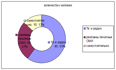Рис. 14. Структура удовлетворенность качеством продукции SRL «Goliat-Vita» жителей АТО Гагаузии Источник: Составлен автором На вопрос: «Откуда Вы узнали о нашей фирме?», большинство респондентов ответило: реклама на ТV и радио - 45 человек или 60%, затем из рекламы печатных СМИ – 20 челове или 27%, а лишь небольшая часть интересовалась самостоятельно – 10 человек или 13% от общего числа опрашиваемых (рис. 15):