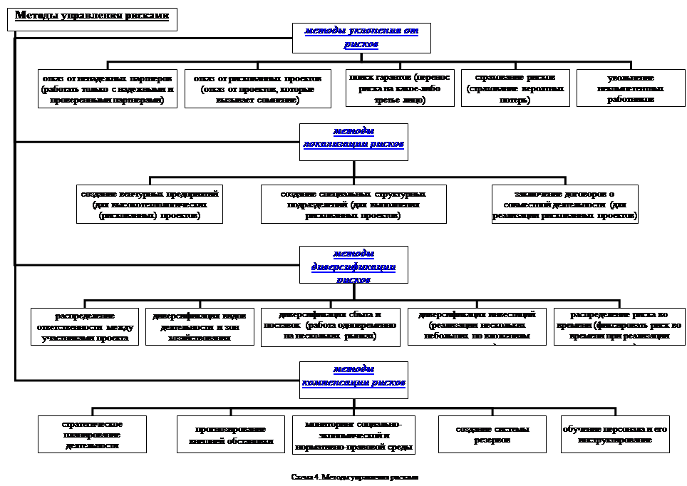 4. Представьте схематично основные группы методов воздействия на риск. В условиях действия разнообразных внешних и внутренних факторов риска могут использоваться различные способы снижения риска, воздействующие на те или иные стороны деятельности предприятия. При выборе конкретного метода управления рисками риск-менеджер должен исходить из следующих принципов: · нельзя рисковать больше, чем это может позволить собственный капитал; · нельзя рисковать многим ради малого; · следует предугадывать последствия риска. Методы воздействия на риск, отвечают на вопросы: «Как снизить риск? Как снизить ущерб?» Рассмотрим ниже основные группы методов воздействия на риск схема 4. Методы уклонения от риска наиболее распространены в хозяйственной практике, ими пользуются предприниматели, предпочитающие действовать наверняка. Методы локализации рисков используются в редких случаях, когда удается довольно четко идентифицировать риски и источники их возникновения. Выделив экономически наиболее опасные этапы или участки деятельности в обособленные структурные подразделения, можно сделать их более контролируемыми и снизить уровень риска. Методы диверсификации рисков заключаются в распределении общего риска Методы компенсации рисков связаны с созданием механизмов предупреждения опасности.