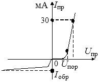 При изменении полярности питающего напряжения необходимо изменить подключение миллиамперметра и вольтметра. Построить вольтамперную характеристику. Определить по ней пороговое напряжение, дифференциальное сопротивление, обратный ток, прямое падение напряжения при токе 30 мА. Определение параметров показано на рис.13.