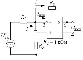 Рис.1. Схема суммирующего усилителя Пусть на инвертирующий вход поступают два сигнала Uвх1 и Uвх2 , которые подключаются к точке 2 через резисторы R2 и R4 . Операционный усилитель является идеальным усилителем напряжения, поэтому для него iвхи ≈0, где iвхи – входной ток инвертирующего входа. Тогда точка 2 является виртуальным нулем и справедливо уравнение i1 + i2 = iос . (1) Значения токов определяются из соотношений: i1