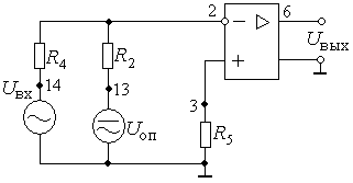 Рис.10. Схема двухвходового компаратора с положительной обратной связью Схема компаратора приведена на рис.10. В ней включен источник опорного напряжения в цепь неинвертирующего входа, а входной сигнал – в цепь инвертирующего входа. В зависимости от полярности опорного напряжения петля амплитудной характеристики сдвигается от нуля влево или вправо. На рис.11 изображена амплитудная характеристика для Uоп >0.