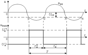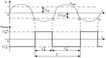 Рис.6. Временные диаграммы работы двухвходового компаратора До момента времени t1 состояние компаратора определяется неинвертирующим входом, так как на нем действует большее по величине напряжение. Как только напряжение на инвертирующем входе превысит значение Uоп на порог срабатывания компаратора, так напряжение на выходе скачком меняется из состояния Uн + в состояние Uн – . Временные диаграммы для периодического входного сигнала и отрицательного значения Uоп приведены на рис.7.