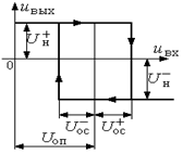 Рис.8. Схема триггера Шмитта Резистор обратной связи соединяет точки 6 и 3. В схеме введена последовательная обратная связь по напряжению, так как напряжение обратной связи Uос пропорционально выходному напряжению и включено во входную цепь последовательно с входным сигналом. Для определения знака обратной связи на вход задается сигнал любого знака, например, положительного. В точке 6 сигнал инвертируется, поэтому на схеме показан отрицательный сигнал, который передается на вход в точку 3, причем, Амплитудная характеристика триггера Шмитта приведена на рис.9. Если на выходе схемы появляется положительное напряжение Uн + , то такой же знак имеет напряжение обратной связи Uос . Для переключения операционного усилителя на инвертирующий вход необходимо подать положительное напряжение. Когда выполняется условие Uвх ≥ Uос , тогда компаратор переключается в другое состояние насыщения Uн ¯ . Для отрицательного выходного напряжения изменяется знак напряжения обратной связи на отрицательный. Чтобы переключить компаратор, необходимо на вход подать отрицательное напряжение, которое должно сравняться с напряжением обратной связи и превысить его на малую величину. В результате переключения усилителя под действием входного сигнала разной полярности получается релейная характеристика в виде петли гистерезиса (рис.9). Пока значение входного сигнала лежит в пределах петли, триггер сохраняет значение выходного сигнала. Это означает, что схема триггера обладает памятью. Значения напряжения Uос называются пороговыми Uпор .