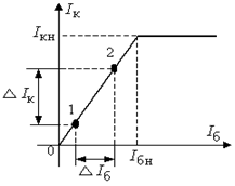 Рис.11. Статическая характеристика передачи транзистора 3. Снятие характеристики передачи в нагрузочном режиме. Для этого в цепь коллектора включить резистор Rк согласно заданному варианту. Схема включения приведена на рис.12. Построить характеристику Iк = B(Iб ) при Rк = const. По ней найти токи насыщения базы и коллектора, а также коэффициент усиления тока. Определение этих величин по характеристике показано на рис.13.