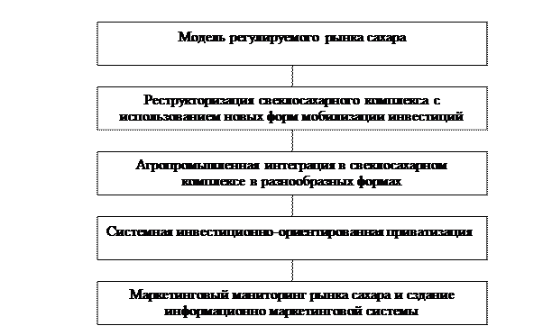 Рис.2 Наполнение модели регулируемого рынка сахара по следующим направлениям. 1.Для избежания относительного перепроизводства, а ровно и дефецита сахара, и значительного снижения цен на него сверх уровня платежеспособности населения, устанавливает объем поставок сахара на внутренний рынок. Это обеспечивает преемлемую для большенства потребителей конечную цену сахара, прибыль свеклосеющим хозяйствам и сахарным заводам, позволяющая повышать эффективность производства и экспортный потенциал комплекса. 2. Производится трансформация существующих органов управления свеклосахарным комплексом путем формирования свеклосахарным комплексом путем формирования новых управленческих механизмов, освоение практики оптимизации интересов государства, свеклосеющих хозяйст и сахарных заводов на основе совместной подготовки и ежегодного межотраслевого соглашения. 3. Определение государственной экономической политики, развитие свеклосахарного производства осуществляется межведомственный комиссией по вопросам регулирования рынка сахара в составе Государственной комиссии по вопросам рынка продовольствия. 4. Создание торгово-снабженческого синдиката «Центр сахар опт» с филиалами в регионах. 5. Целесообразно для защиты экономических, производственных и социальных интересов свеклосеющих хозяйств и сахарных заводов, а так же наделение ддругих финкций создать добровольные негосударственные национальные ассоциации свеклосеющих хозяйств и сахарников. 6.Проведение подготовки и переподготовки инженерно – технических и экономических кадро, служащих предприятий и организаций свеклосахарного комплекса. 7. В свеклопроизводящих организациях следует производить концентрацию производства сахарной свеклы, внедрение в производство ресурсосберегающих технологий, оптимизировать площади посева в свеклосахарном производстве. В России накоплен достаточный опыт по регулированию взаимоотношений партнеров свеклосахарного комплекса, примером может служить механизм взаимоотношений свеклосеющих хозяйств и сахарных заводов в Воронежской области, Курской областях. (рис.3)