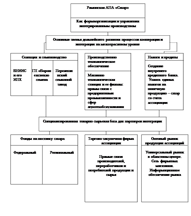 Рис.3. Модель перспективного развития организационно – экономических структур в интегрированном свеклосахарном призводстве (на примере Рамонский АПА «Сахар», Воронежская область) В зарубежной практике его аналогами являются особые договора, например, Общей Конфедерацией свекловодов и Национальным объединением производителей сахара Франции, договор между Конфедерацией свекловодов и Генеральным Обществом производителей сахара Бельгии, аналогичные договора в Германии и в других развитых странах – продуцентах сахара. Анализ показывает, что они являются своеобразными «конституциями» свеклосахарного производства, охватывают все аспекты взаимоотношений между партнерами комплекса. |