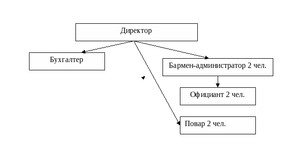 По данным таблицы 2.5.4. продолжительность оборота оборотных средств увеличилась на 1,1 день, что привело к сокращению оборачиваемости оборотных средств. 2.6. Анализ организационной структуры управления предприятия Под организационной структурой управления понимается состав, соподчиненность, взаимодействие и распределение работ по подразделениям и органам управления, между которыми устанавливаются определенные отношения по поводу реализации властных полномочий, потоков команд и информации. Организационная структура управления предприятия является линейной, где функции управленческого воздействия сосредоточены на директоре кафе, остальной персонал подчинен непосредственно ему. Согласно штатного расписания, в кафе трудятся 8 человек: из них двое – административно-управленческий персонал, а шестеро – обслуживающий персонал. Рис.2.6.1. Организация структуры управления ООО «Ресторатор» Основные функциональные обязанности Директор Директор несет персональную ответственность за выполнение плановых заданий, за состояние бухгалтерского учета, контроля и сохранность собственности. Он отвечает за результаты торгово-финансовой и производственной деятельности, качество выпускаемой продукции, культуру обслуживания, соблюдение плановой, финансовой, сметной дисциплины, действующего законодательства, приказов и инструкций. Директор обеспечивает правильный подбор, расстановку и воспитание кадров, создает условия для безопасной работы, отвечает за совершенствование организации труда и формы обслуживания посетителей. Он принимает и увольняет работников, входящих в штат предприятия, распоряжается материальными, денежными средствами, издает приказы, распоряжения, заключает договоры (соглашения), поощряет работников, налагает дисциплинарные взыскания. Директор должен: обеспечить выполнение плановых заданий; организовать четкое, планомерное снабжение предприятия сырьем, продуктами, полуфабрикатами, предметами материально-технического оснащения; создать необходимые условия для сохранности товарно-материальных ценностей; обеспечить четкое выполнение всеми работниками правил внутреннего распорядка. Бухгалтер Ведет на предприятии бухгалтерский учет, отвечает за достоверность учета и отчетности, контролирует приход и расход ТМЦ и денежных средств. Бармен-администратор Обязан: непосредственно руководить всей работой официантов; контролировать соблюдение ими правил обслуживания посетителей, внутреннего распорядка, ношения форменной одежды; устанавливать совместно с работниками сервизной порядок получения, обмена и сдачи официантами посуды и других предметов сервировки; обеспечивать своевременную подготовку торгового зала к открытию кафе. В течение дня должен находиться в зале, следить за поддержанием чистоты и порядка и правильностью сервировки столов. По окончании рабочего дня обязан проследить за уборкой зала, сдачей официантами в кассу авансовых сумм и выручки за день. Официант Должен: в совершенстве владеть методикой работы и техникой обслуживания; знать нормы этикета и правила поведения за столом; проявлять такт и вежливость в процессе обслуживания; иметь безукоризненный внешний вид (опрятная, аккуратная прическа, форменная одежда и т.д.); знать характеристику блюд, закусок, холодных и горячих напи
