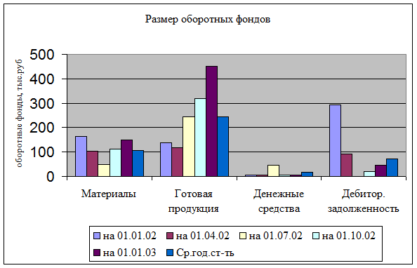 Введение В современном обществе важную роль в механизме управления экономикой выполняет статистика. Она осуществляет сбор, научную обработку, обобщение и анализ информации, характеризующей развитие экономики страны, культуры и уровня жизни населения. В результате предоставляется возможность выявления взаимосвязей в экономике, изучения динамики ее развития, проведения сопоставлений и в конечном итоге – принятия эффективных управленческих решений. Статистика является методологической основой для многих экономических дисциплин. В частности, наиболее тесным образом связаны статистика и анализ. Статистическая методология является в анализе основополагающей. Все аналитические данные получают с помощью статистических приемов. В данной курсовой работе рассмотрено применение статистических методов при проведения анализа оборотных фондов. Актуальность данной темы объясняется динамичным развитием рыночным отношений, необходимостью своевременного анализа состояния предприятия и, в частности, состояния оборотных фондов. В аналитической части рассматривается состояние, динамика, средние и индексные показатели оборотных фондов, исчисленные с помощью статистических методов на примере данных, полученных при изучении отчетности Каменского сельского лесхоза за 2002 год и 1 квартал 2003 года. Работа выполнена с использованием пакетов прикладных программ MSWord и MSExcel. 1. Статистические методы анализа оборотных фондов 1. 1. Состав оборотных фондов Оборотные фонды имеют очень важное значение для производства. Оборотные средства представляют собой используемые в процессе производства предметы труда и материальные ценности. Они обеспечивают осуществление непрерывного процесса производства и реализации продукции. Экономическая сущность оборотных фондов заключается в том, что они полностью переносят свою стоимость на вновь созданную продукцию. Оборотные фонды участвуют в процессе производства в течение одного производственного цикла и, следовательно, требуют постоянного возмещения на прежнем уровне при простом воспроизводстве или в увеличенных размерах при расширенном воспроизводстве. Оборотные фонды представляют собой совокупность оборотных производственных фондов и фондов обращения. Фонды обращения состоят из готовой к реализации товарной продукции, средств в расчетах с покупателями, а также денежных средств, необходимых для покупки сырья, материалов и др. К оборотным фондам относятся сырье и материалы, незавершенное производство. Оборотные средства находятся в состоянии непрерывного движения, осуществляя кругооборот за определенное время, последовательно проходя при этом три основные стадии. На первой стадии предприятие приобретает необходимые для производственной деятельности предметы труда. На второй стадии производственные запасы расходуются в производстве, но по завершении которого превращаются в продукцию. На третьей стадии, произведенная в хозяйстве продукция реализуется и оборотные средства принимают денежную форму. 1. 2. Метод группировок при анализе оборотных фондов Метод группировок при анализе оборотных фондов в основ применяется для изучения структуры и структурных сдвигов в составе оборотных фондов. Применяются три вида группировок: типологическая, структурная и аналитическая (фактор