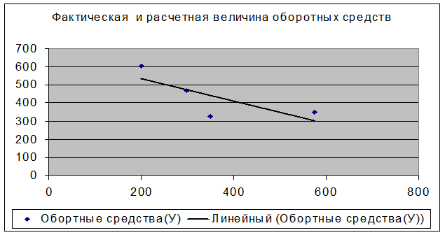 Уср = 438,050 тыс. руб. ∑ (У – Уср)^2 = 49739,890 тыс. руб. Индекс корреляции = -0,758 Данное значение индекса парной корреляции отражает тесную обратную связь между величиной выручки от реализации и объемом оборотных средств. Коэффициент детерминации = 57,5% Это значит, что величина оборотных средств на 57,5% зависит от выручки от реализации, а остальные 42,5% - это влияние других факторов, не учтенных в модели. Однофакторная прямолинейная корреляционно-регрессионная модель будет иметь вид: Ур = 656,900 – 0,615х Графическое отражение сопоставления расчетных и фактических данных