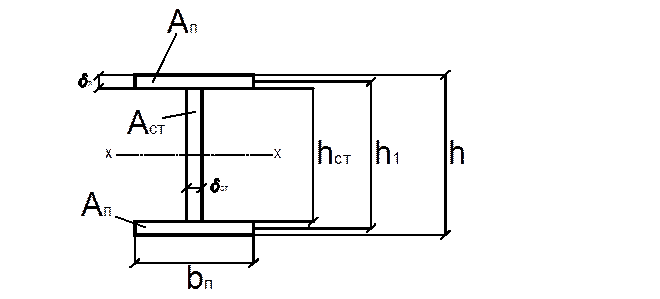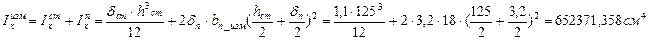 Рис. 4.3. Габариты сечения главной балки ) 2) 3) 4) lx = lx (ст) + lx ( n ) = σст * hcn 3 /12 + 2*( bn * σ n 3 /12 + ( bn * σ n )*( h ст + σ n )/2) = 1,1*(125)3 /12 + 2*(68,266 + 328704,8) = 836582,592 (см4 ) 5)