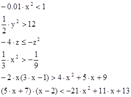 -3 3. Построить график функции f(x) (схематично). Определить по графику значения х при которых функция принимает положительные значения, отрицательные значения. 1) 2) 3) 4.Решите графически неравенства 1) 2) 3) 4) 4. Найдите, при каких значениях х трёхчлен · · 5. Решите неравенства. a) х2 <16; b) х2 ≥3; c) 0,2х2 >1,8; d) -5х2 ≤х. 6.Найдите множество решений неравенств: a) 3х2 +40х+10<-х2 +11х+3; b) 9х2 -х+9≥3х2 +18х-6; c)2х2 +8х-111<(3х-5)(2х+6). 7. Докажите, что при любом значении переменной верно неравенство: a) 4х2 +12х+9≥0; b) -5х2 +8х-5<0. III.Применение алгоритма На этом этапе работы с алгоритмом задания предлагаются аналогичные рассмотренным, но с постепенным усложнением. В ходе решения учитель проверяет правильность понимания учащимися изученного вопроса, уточняет формулировки, разъясняет допущенные ошибки. 1.Решите неравенство. 1) 2) 3) 2x (3x-1)>4x2 +5x+9 4) (5x+7)(x-2)<21x2 -11x-13 2. Найдите общее решение неравенств х2 +6х-7 ≤ 0 и х2 -2х-15 ≤ 0 3.Докажите, что: · х2 +7х+1>-x2 +10x-1 при любом х; · -2х2 +10х<18-2x при х≠3. 4. Одна сторона прямоугольника на 7 см больше другой. Какой может быть сторона, если площадь прямоугольника меньше 60 см2 .
