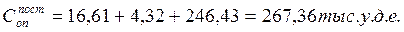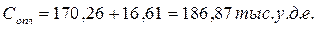 16. Амортизация (п.14+п.15): А = Ао + Ана , А = 37,5+395,41= 432,91 тыс.у.д.е. 17. Затраты на рекламу и маркетинговые исследования: Смарк = Спр = 246,43тыс.у.д.е. 18. Суммарные затраты на производство, (п.13+п.16+п.17+п.18): С=Соп +А+Смарк +Скр , С= 1937,89+432,91+246,43=2617,23тыс.у.д.е. 19.Себестоимость ед. продукции: