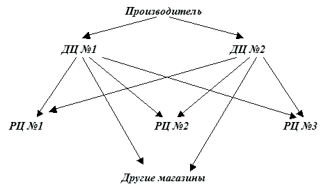 Различают также две формы товарных поставок: транзитную и складскую. Транзитная форма поставок предполагает прямые поставки товаров от производителей к заказчикам (например, розничным магазинам). Имеет место конкуренция между транзитной и складской формами поставок. И у той, и у другой системы есть свои преимущества. При транзитной форме: заказчик, напрямую контактируя с изготовителем, влияет на уровень качества выпускаемой продукции. При складской форме: более крупные закупочные партии позволяют снижать отпускные цены изготовителей; Рассмотрим подробнее складскую форму товародвижения. Принято различать две группы складских помещений - это распределительные (далее РЦ) и дистрибьютивные (далее ДЦ) центры. Первая группа складов обслуживает магазины той розничной сети, которой принадлежит данный РЦ, и содержит большинство товарных позиций ассортиментного набора. Дистрибьютивные центры, напротив, работают с разными магазинами и обслуживают мелко-и крупнооптовых покупателей. Условно складскую схему товародвижения можно представить следующим образом: