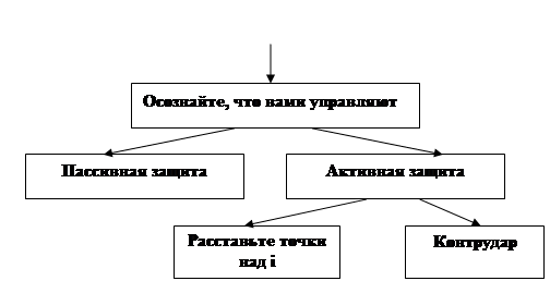 ![]() Как защититься от чувства вины : Вы не должны: · отвечать, если вам не хочется; · стремиться всегда выглядеть привлекательным; · быть рабом ранее сказанных вами слов; · разбираться во всем. Вы имеете право: · на ошибку; · быть непонятливым или чего-то не знать; · быть нелогичным; · сказать «я хочу»; · воспринимать себя таким, каков вы есть, не насиловать себя. Невербальные признаки манипуляции : жесты, говорящие о неискренности, скрытности, сомнениях, превосходстве, угрозе, в частности – жестикуляция левой рукой. Кроме того, можно наблюдать определенную необычность в поведении манипулятора (излишнюю возбужденность или показное безразличие). Вербальные признаки манипуляции : · Ответственность за предлагаемое действие ложится целиком на адресата. · «Плата» адресата перевешивает его выигрыш · Элементы принуждения · Подготовительная преамбула перед непринуждающими словами манипулятора · Дефицит времени, отпущенного на принятие решения 4.2 Пассивная защита Пассивную защиту рекомендуется применять в следующих ситуациях: - когда вы не знаете, как поступить; - когда не хотите портить отношения с манипулятором. Единственное, что нужно для применения пассивной защиты – проявить выдержку. Пассивная защита может осуществляться в следующих формах. · Никак не реагируйте на слова манипулятора, молчите, делая вид, что не расслышали, не обратили внимания, не поняли. · Делайте вид, что не поняли, о чем речь. · Заговаривайте совсем о другом. · Повторяйте просьбу манипулятора, но с вопросительной интонацией, требуя тем самым продолжить его речь. В отличие от описываемых далее активных методов пассивные методы не извлекают на поверхность тайные намерения манипулятора, поскольку последние направлены против намеченной жертвы, то придание их огласке привело бы к конфликту. Оставление же намерений агрессора в тени позволяет мягко уйти от конфликта, избежав в то же время участи жертвы. 4.3 Активная защита Манипулятор обычно знает о нашем желании выглядеть хорошо. Поэтому не бойтесь показаться плохим, сказав, например: «Боюсь, ты сильно преувеличиваешь мои достоинства» (щедрость, возможности, способности). Эти слова снимают с вас сковывающие путы и открывают широкое поле действий. Если пассивная защита означает «остановить агрессора», то активная – разоблачить его и нанести ответный удар. Дело в том, что активная защита является встречным конфликтогеном, не уступающим, а то и превосходящим по силе действие манипулятора. Защита «Расставьте точки над i » Суть этого метода состоит в том, что нужно прямо, не стесняясь, сказать о том, что вас беспокоит. Или потребовать разъяснения: «куда вы клоните?», «Скажите прямо», «Что вы хотите?» Одна из главных задач данного вида защиты – сделать тайное (намерения манипулятора) явным. Итак, защита «Расставим точки над i» разрушает сценарий манипулятора, но практически не наносит ему ущерба. Адресат удовлетворяется тем, что он сам не пострадал, а манипулятор понял, что он своей цели не достигнет. Встречный удар – контрманипуляция Контрманипуляция – наиболее сильная из защит – представляет собой ответную манипуляцию, в которой используются обстоятельства, созданные первоначальным манипулятивным воздействием нападающего субъекта. Исполнение контрманипуляции: сделать вид, будто не понимаешь, что тобой пытаются 