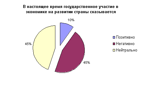 В целом, по мнению экспертов, степень участия государства в экономике является умеренно-высокой. В своих комментариях аналитики отмечают доминирующее положение государства в целом ряде отраслей - в первую очередь в энергетике. Однако особого энтузиазма по поводу участия государства в экономике эксперты не испытывают. При чём речь идёт не только о состоянии отраслей, контролируемых государством, но и о регулировании государством экономической деятельности в целом. Вместе с тем, аналитики отмечают тенденцию к вынужденному снижению роли государства в экономике "как в силу относительного ослабления государства, так и в силу недостатка ресурсов". Некоторые аналитики отметили, что тормозится формирование законодательной базы, в частности по защите прав инвесторов, "наблюдается непоследовательность в действиях". Как выразился один их аналитиков "когда власти Украины одновременно говорят и о реприватизации, и о необходимости привлечении инвесторов, трудно понять, чего на самом деле она [Украина] хочет, и как она хочет этого добиться". Экономика и внутренняя политика
