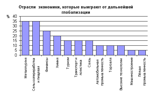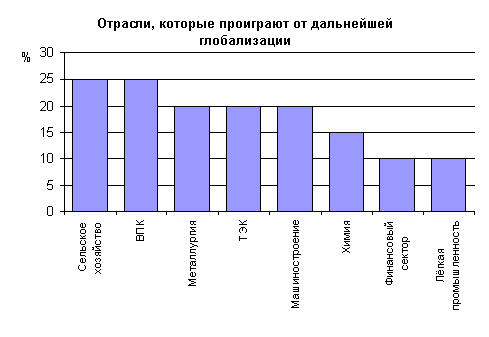 Последствия глобализации и интеграции в мировой рынок для отраслей украинской экономики, судя по ответам аналитиков, выглядят довольно противоречивыми. В своих комментариях некоторые аналитики отметили, что глобализация будет иметь как положительные, так и отрицательные последствия. И от украинского бизнеса зависит - смогут ли украинские предприятия воспользоваться преимуществами интеграции в мировой рынок, а от украинской власти во многом зависит минимизация отрицательных последствий для всей украинской экономики. В качестве неизбежного следствия глобализации некоторые аналитики отмечают рост цен на энергоносители до мирового уровня, что, по их мнению, негативно отразится на всей украинской экономике. Однако, несмотря на все издержки и трудности отдельных отраслей, в целом интеграция в мировой рынок рассматривается аналитиками как позитивный фактор для всей украинской экономики. В тоже время, по мнению некоторых аналитиков, отдельные отрасли экономики будут для Украины потеряны - в частности военно-промышленный комплекс. Украина и мир
