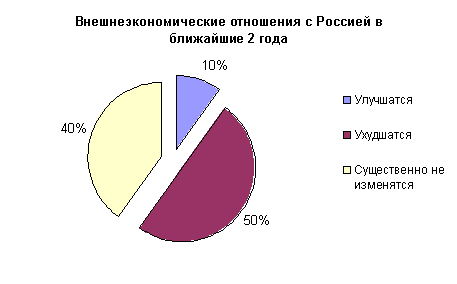 Зависимость украинской экономики от внешнеполитической ситуации аналитики оценивают как очень высокую. При этом абсолютно все эксперты считают, что отношения с Россией оказывают наибольшее влияние на экономическую ситуацию в стране. Однако в перспективы улучшения российско-украинских отношений аналитики не верят, скорее наоборот - ожидают их ухудшения. Примечательно, что в своих комментариях к ответам треть аналитиков указала на зависимость перспектив отношений с Россией от внутриполитических процессов ("формата коалиции в украинском парламенте"). Перспективы