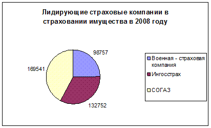 Рисунок 10 - Лидирующие страховые компании в страховании имущества Таким образом, можно отметить, что эти компании и обеспечивали сверхвысокие темпы роста премий, как по всему рынку страхования, так и по рынку страхования имущества. В 2008 году по Хабаровскому краю было собрано страховых премий (кроме обязательного медицинского страхования) в размере 3173288 тысяч рублей. Из них на добровольное страхование приходится 2439220 тысяч рублей. В том числе на страхование жизни 223639 тысяч рублей; на личное страхование (кроме жизни) 1122248 тысяч рублей; на страхование имущества приходится (кроме страхования ответственности) 989455 тысяч рублей, из них на страхование имущества юридических лиц приходится 430198ыяч рублей; на страхование ответственности приходится 103878 тысяч рублей.
