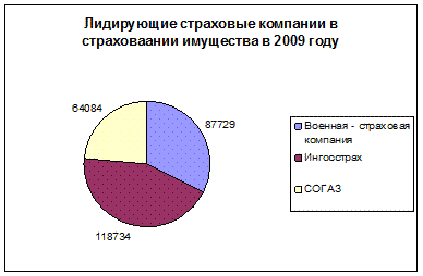 Таким образом, можно сделать вывод, что в 2009 году сбор страховых премий по всему рынку добровольного страхования сократился. Самое большое сокращение сбора страховых премий произошло в страховании имущества юридических лиц. Эта тенденция может объясниться экономических кризисом 2009 года. В 2009 году произошло сокращение доходов предприятий, следовательно большинство предприятий, которые ощутили на себе экономический кризис отказались от договоров страхования имущества, а это следствие сократило число договоров, и следовательно сократило число поступлений страховых премий. Лидирующей страховой компанией в 2009 году по сбору страховых премий в страховании имущества является Ингосстрах 118734 тысяч рублей, на втором месте Военная - страховая компания - 87729 тысяч рублей, на третьем месте СОГАЗ - 64084 тысяч рублей (Рисунок 14).