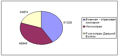Рисунок 15 - Страховые выплаты компаний Хабаровского края в 2007 году В 2008 году страховые выплаты по страхованию имущества по Хабаровскому краю составили 1335480 тысяч рублей. Из них на страхование имущества (в целом) пришлось 23202 тысяч рублей, а на страхование имущества юридических лиц - 38671 тысяч рублей. Лидирующей компанией по страховым выплатам является Военная - страховая компания. Её выплаты составили 51328 тысяч рублей. На втором месте страховая компания Ингосстрах - 48945 тысяч рублей. На третьем месте Росгосстрах Дальний Восток - 24874 тысяч рублей (Рисунок 16, Приложение Ж).