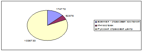 Рисунок 16 - Лидирующие страховые компании по страховым выплатам в 2008 году Таким образом, за 2007 - 2008 года можно отметить, что страховые выплаты по страхованию имущества увеличились с 117335 тысяч рублей до 232029. То есть темп роста страховых выплат по страхованию имущества (в целом) составил 97,74 % (почти в 2 раза увеличились). А по страхованию имущества юридических лиц страховые выплаты увеличились с 37850 до 38671 тысяч рублей. То есть темп ростра страховых выплат в этом виде страхования составляет 2,17 %. То есть страховые выплаты увеличились не значительно. В 2009 году страховые выплаты по Хабаровскому краю составили 2 352 409 тысяч рублей. Из них на страхование имущества (в целом) пришлось 1439319 тысяч рублей, а на страхование имущества юридических лиц пришлось 37495 тысяч рублей. Лидирующей компанией по страховым выплатам является Русский страховой центр - 1036730 тысяч рублей. Военная - страховая компания на втором месте - 174772 тысяч рублей. Страховая компания Ингосстрах на третьем месте - 62575 тысяч рублей (Рисунок 17, Приложение З).