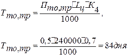 Общее время цикла, кроме дней расхождения автомобиля в исправном состоянии, включает в себя и продолжительность его облуживания и ремонта. Тц = Тр + Тр вп + Трем + Твп рем , К1 = 0,8 – коэффициент, учитывающий категорию условий эксплуатации; К2 = 1,0 – коэффициент, учитывающий тип и модификацию состава; К3 = 1,0 – коэффициент, учитывающий природно-климатические условия; Нормы пробега до капитального ремонта: Lц = L · К1 · K2 · K3 Lц = 300000 · 0,8 · 1 · 1 = 240000 км Определяем величину Тр :