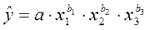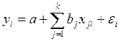где a – свободный член уравнения; k – число факторов; j – номер фактора; i – номер единицы совокупности; bj – коэффициент условно-чистой регрессии при факторе xj , измеряющий изменение результата при изменении фактора на его единицу, и при постоянстве прочих факторов, входящих в модель; εi – случайная вариация yi , не объясненная моделью. Модель в форме (22) является аддитивной. Это означает, что в основе модели лежит гипотеза о том, что каждый фактор что-то добавляет или что-то отнимает от значения результативного признака. Такая гипотеза о типе связи причин и следствия вполне отражает ряд экономических систем взаимосвязанных признаков. Например, если y – это урожайность сельскохозяйственной культуры, а x 1 ,x 2 , …,xk – агротехнические факторы: дозы разных видов удобрений, число прополок, поливов, доля потерь при уборке, то действительно, каждый из этих факторов либо повышает, либо снижает величину урожайности, причем результат может существовать и без любых из перечисленных факторов. Однако аддитивная модель пригодна не для любых связей в экономике. Если изучается такая связь как зависимость объема продукции предприятия y от занимаемой площади x 1 , числа работников x 2 , стоимости основных фондов x 3 (или всего капитала), то каждый из факторов является необходимым для существования результата, а не добавлением к нему. В таких ситуациях нужно исходить из гипотезы о мультипликативной форме модели: