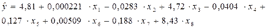 Однако надежно отличными от нуля оказались только коэффициенты при x 3 (t -критерий равен 10,5) и при x 8 (t -критерий равен 2,72). Большую надежность, чем другие факторы имеет и x 5 . После отсева ненадежных факторов, т.е. исключения их из уравнения, окончательное уравнение регрессии таково: