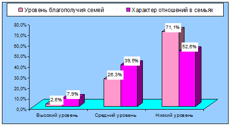 Рис. 4 – Показатели благополучия семейТаким образом, из поведенного данного исследования, можно сказать, что трудные подростки в основном из неблагополучных семей (71,1%) и естественно это не может не отразиться на поведении трудных подростков. Какое- либо воспитание в этих семьях отсутствует, не говоря уже об организации семейного досуга и досуга трудных подростков. Следующее соизмерение было направлено на определение взаимоотношений между трудного подростками и родителями. Нарушение семейных отношений и отклонения в воспитании приводят к возникновению и развитию отклонений в поведении трудных подростков. Данное направление проводилось с помощью анкеты, для семьи (Приложение Б). В качестве критериев позитивных взаимоотношений мы выделили следующие факторы: 1 – доброта, 2 – согласие, 3 – теплота, 4 – готовность прийти на помощь, 5 – сотрудничество. Для выявления негативного отношения в качестве критериев определили следующие признаки:1 – несогласие, 2 – равнодушие, 3 – частые конфликты, 4 – отсутствие сотрудничества, 5 – холодность. По наличию данных факторов мы определили характер взаимоотношений между подростками и родителями. После подводим итоги, складываем отмеченные цифры. Итоговый показатель – сумма – может колебаться от 0 (негативные) до 10 (позитивные). Таким образом, у 57,9% (22) семей взаимоотношения носят неустойчивый характер, т.е. они могут быть и негативными и позитивными в зависимости от ситуации. У 13,2% (5) семей взаимоотношения характеризуются как позитивные, стабильные. У 28,9% % (11) семей взаимоотношения негативные. В динамике это выглядит так, Рисунок 5.