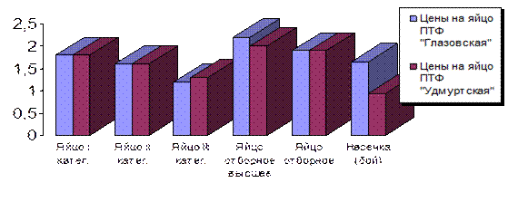 Яйцо столовое III категории: q=(1,20/1,30)×100%=92,3%, яйцо данной категории ПТФ «Глазовская» превосходит по экономическому параметру яйцо ПТФ «Удмуртская». Яйцо столовое отборное: q=(2,20/2,0)×100%=110%, яйцо данной категории ПТФ «Глазовская» уступает в превосходстве по экономическому параметру яйцу ПТФ «Удмуртская». Яйцо насечка (бой): q=(1,65/0,9)×100%=183,3%, яйцо данной категории ПТФ «Глазовская» уступает в превосходстве по экономическому параметру яйцу ПТФ «Удмуртская». По готовой продукции (яйцо) можно сделать вывод, что из шести категорий яйца цены по трем категориям: I категория, II категория и отборное одинаковые у обеих ПТФ; хотя у этих птицефабрик разные направления производства. ПТФ «Глазовская» - яичная, ПТФ «Удмуртская» - мясная.