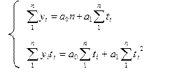 Чтобы дать количественную модель, выражающую общую тенденцию изменений уровней динамического ряда во времени используется аналитическое выравнивание ряда динамики. В этом случае фактические уровни заменяются уровнями, вычисленным на основе определенной прямой или кривой, выбранной в предположении, что она отражает общую тенденцию изменений во времени изучаемого общественного явления. При аналитическом выравнивании ряда динамики закономерно изменяющийся уровень рассчитывается как функция времени 1) линейная функция 2) парабола второго порядка Выбор формы кривой во многом определяет результаты экстраполяции тренда. Рассмотрим аналитическое выравнивание ряда динамики по прямой, т.е. аналитическое уравнение вида: Параметры