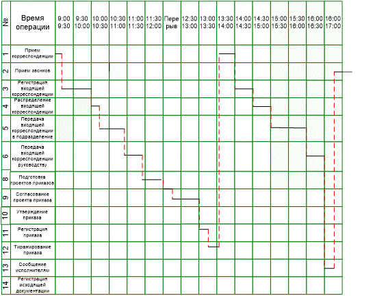 Рисунок 6 - Хронооперограмма Работа с документами в «СТРОЙ - ЛЕГИОН» проводится секретарем. Секретарь руководствуется в своей деятельности законами РФ, правилами, должностной инструкцией, действующими нормативами по вопросам документационного обеспечения управления, Уставом ООО «СТРОЙ - ЛЕГИОН». В «СТРОЙ - ЛЕГИОН» применяется централизованная система делопроизводства, в которой все технические операции по обработке документов выполняются секретарем. К преимуществам централизованной формы организации делопроизводства относится возможность формирования единой базы данных по всем поступающим в организацию и создаваемым в ней документам, что позволяет повысить оперативность поиска документов и, следовательно, оптимизировать справочную работу по документам. Централизованную форму организации делопроизводства целесообразно использовать в том случае, если организация имеет линейно-функциональную организационную структуру, какую имеет «СТРОЙ - ЛЕГИОН». Недостатки централизации заключаются в том, что решения принимают лица, плохо знающие конкретные обстоятельства; затрачивается много времени на передачу информации, а она сама теряется. В таблице 1 представлен объем документооборота входящих, исходящих и внутренних документов. В соответствии с ней, выявлена тенденция увеличения объема документооборота. Таблица 1 – Объем документооборота
