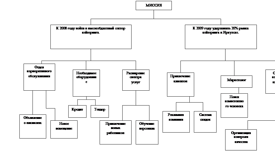 Содержание 1. Общие сведения о проектируемой организации 1.1 Краткая характеристика организации 1.3 Анализ внутренней среды организации 2. Разработка системы управления 2.2 Обоснование выбора стратегии развития 2.3 Разработка организационной структуры 2.4 Разработка системы мотивации персонала 2.5 Разработка системы контроля в организации Список использованной литературы ВведениеРынок общественного питания сейчас переживает в России свой золотой век. Практически во всех сферах наблюдается бурный рост и в то же время рынок ещё далёк от насыщения - места пока хватает всем. Как говорил известный американский менеджер Ли Якокка: "Нужно быть поближе к общественному питанию, потому что, как бы плохо ни шли дела, есть людям всё равно надо", - то есть данный сектор является весьма стабильным. В настоящее же время можем наблюдать появление всё новых направлений в этой сфере, так как потребительский спрос усложняется и требует постоянно расширяющегося набора услуг. Что связано с постепенным переходом мирового сообщества из индустриальной стадии развития в постиндустриальную, способствовавшему изменению образа и стиля жизни. На ряду с фаст-фудом и кухней "фьюжн" (от англ. fusion- сплав) у нас в стране появился и кейтеринг. Пришел он только в начале девяностых вместе с понятием "корпоративная культура" и западными компаниями. Поначалу основными игроками на только организовавшемся рынке были иностранные компании (в частности, французская Sodexho), но затем и наши фирмы (такие, как "ЛаньЧ" и "Бризоль") начали успешно составлять им конкуренцию. Сегодня рост кейтеринга в мире составляет около 13% в год, в России у крупнейших операторов рост составляет от 25 до 70% в год. В среднем по отечественному рынку этот показатель, по данным компании "ЛаньЧ", равен 30%. По признанию игроков традиционного ресторанного сегмента, более высокая рентабельность при коротких сроках окупаемости вложений делает этот бизнес чрезвычайно привлекательным, поэтому кейтеринг активно развивается не только в мегаполисах, но и на периферии. На иркутском рынке действует около 10 организаций, оказывающих кейтеринговые услуги. Столь небольшое число фирм в данном секторе говорит о большом потенциале развития рынка. Отсюда создание кейтеринговой организации в нашем городе считаю весьма перспективным. 1. Общие сведения о проектируемой организации1.1 Краткая характеристика организацииОбщество с ограниченной ответственностью "PerfectLunch" представляет собой добровольное объединение 2 граждан с целью осуществления совместной хозяйственной деятельности (а именно оказания услуг выездного ресторанного обслуживания) путем первоначального образования уставного фонда. По характеру деятельности предприятие является коммерческим, поскольку одной из его целей является извлечение прибыли. В Иркутске в настоящее время услуги кейтеринга предоставляют всего около 10 фирм - рынок практически свободен. Кейтеринг (от англ. catering - "снабжение провизией") - выездное ресторанное обслуживание в любом помещении по выбору клиента. Можно сказать, что он является воплощением индустрии мобильного общепита. Так как наша компания только вышла на рынок, то предоставляет не весь спектр кейтеринговых услуг, а занимается только индивидуальным обслуживанием на уровне организации питания сотрудников различных фир