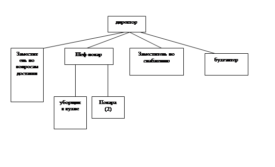 Как видно из таблицы SWOT-анализа, у организации хорошие возможности для реализации своих сильных сторон в плане первоначального укрепления позиций на рынке, а позднее расширения его за счёт производства нового продукта (новые виды кейтеринг-услуг). Исходя из этого, целесообразнее на настоящий момент выбрать стратегию усиления позиций на рынке. По классификации же Портера нашей компании в настоящий момент подходит стратегия фокусирования - концентрация усилий на предоставлении услуг офисным работникам. 2.3 Разработка организационной структурыВвиду того, что наша организация пока работает в низкобюджетном секторе кейтеринга, то количество работников предприятия не велико, однако вполне обеспечивает рентабельность на данном этапе развития. А именно, "PerfectLunch" состоит из: Директор. Выполняет стандартные управленческие обязанности: организовывает и следит за работой компании, чтобы её функционирование соответствовало поставленным целям, налаживает контакты с клиентами. В подчинении у директора находятся четыре человека (бухгалтер, заместители по снабжению и вопросам доставки, а также шеф-повар). Согласно таблице степени сложности работы руководителя по основным факторам диапазон управления отвечает нормам. Директор обладает как распорядительными, так и параллельными полномочиями. Заместитель по вопросам доставки. Решает непосредственно все проблемы, связанные с организацией доставки пищи клиентам. Очень важная должность в организации, так как человек, её занимающий, отвечает за момент, как раз и отличающий нас от статического ресторана - поэтому данная функция должна выполняться на высшем уровне. Данный зам. обладает координационными полномочиями. Шеф-повар. Отвечает за своевременно и высококачественно приготовление пищи, тем более что в его распоряжении имеется всё необходимое оборудование; также разрабатывает меню (учитывая текущие тенденции: например, посты или моду на здоровый образ жизни). Обладает распорядительными и рекомендательными полномочиями в отношении подчинённых: двух поваров и уборщика. Диапазон управления (3 чел) отвечает нормам. Заместитель по снабжению. Отвечает за закупку продукции, работает с поставщиками. Бухгалтер. Отвечает за предоставление бухгалтерской отчётности в компании. Повара (2 чел). Занимаются непосредственным приготовлением блюд, также в их обязанность входит мытьё посуды. Уборщик. Занимается уборкой кухонного помещения: выносит мусор, моет полы и прочее.