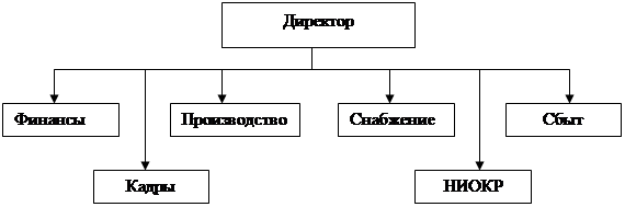 Рис.1 Линейная организационная структура 2.2. Функциональные структуры Функциональная организационная структура основана на создании подразделений для выполнения определённых функций на всех уровнях управления. К таким функциям относят исследования, производство, сбыт, маркетинг и т.д. Здесь с помощью директивного руководства могут быть соединены иерархически нижние звенья управления с различными более высокими звеньями управления. Передача поручений, указаний и сообщений осуществляется в зависимости от вида поставленной задачи. Например, рабочий в цехе получает поручения не от одного человека (мастера), а от нескольких штатных единиц, т.е. действует принцип многократной подчинённости. Поэтому такую организационную структуру называют многолинейной. Функциональная структура управления производством нацелена на выполнение постоянно повторяющихся рутинных задач, не требующих оперативного принятия решений. Функциональные службы обычно имеют в своём составе специалистов высокой квалификации, выполняющих в зависимости от возложенных на них задач конкретные виды деятельности. К преимуществам такой структуры можно отнести: - сокращение звеньев согласования - уменьшение дублирования работ - укрепление вертикальных связей и усиление контроля за деятельностью нижестоящих уровней - высокая компетентность специалистов, отвечающих за выполнение конкретных функций К недостаткам: - неоднозначное распределение ответственности - затруднённая коммуникация - длительная процедура принятия решений Возникновение конфликтов из-за несогласия с директивами, так как каждый функциональный руководитель ставит свои вопросы на первое место.