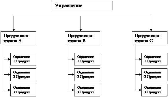 Рис.3 Линейно-функциональные структуры 2.4. Линейно-штабные структуры Такой вид организационной структуры является развитием линейной и призван ликвидировать ее важнейший недостаток, связанный с отсутствием звеньев стратегического планирования. Линейно - штабная структура включает в себя специализированные подразделения (штабы), которые не обладают правами принятия решений и руководства какими - либо нижестоящими подразделениями, а лишь помогают соответствующему руководителю в выполнении отдельных функций, прежде всего, функций стратегического планирования и анализа. В остальном эта структура соответствует линейной Достоинства линейно - штабной структуры: - более глубокая, чем в линейной, проработка стратегических вопросов; - некоторая разгрузка высших руководителей; - возможность привлечения внешних консультантов и экспертов; При наделении функциональных подразделений правами функционального руководства такая структура - хороший первый шаг к более эффективным органическим структурам управления. Недостатки линейно - штабной структуры: - недостаточно четкое распределение ответственности, т. к. лица, готовящие решение, не участвуют в его выполнении; тенденции к чрезмерной централизации управления; Вывод: линейно - штабная структура может являться хорошей промежуточной ступенью при переходе от линейной структуры к более эффективным. Структура позволяет, правда в ограниченных пределах, воплощать идеи современной философии качества. 2.5. Девизиональные структуры Первые разработки концепции и начало внедрения дивизиональных структур управления относятся к 20-м гг., а пик их промышленного использования приходится на 60-70-е гг. Необходимость новых подходов к организации управления была вызвана резким увеличением размеров предприятий, диверсификацией их деятельности и усложнением технологических процессов в условиях динамично меняющейся внешней среды. Первыми перестройку структуры по этой модели начали крупнейшие организации, которые в рамках своих гигантских предприятий (корпораций) стали создавать производственные отделения, предоставляя им определенную самостоятельность в осуществлении оперативной деятельности. В то же время администрация оставляла за собой право жесткого контроля по общекорпоративным вопросам стратегии развития, научно-исследовательских разработок, инвестиций и т.п. Поэтому данный тип структуры нередко характеризуют как сочетание централизованной координации с децентрализованным управлением (децентрализация при) сохранении координации и контроля). Ключевыми фигурами в управлении организациями с дивизиональной структурой становятся не руководители функциональных подразделений, а управляющие (менеджеры), возглавляющие производственные отделения. Структуризация организации по отделениям производится обычно по одному из трех критериев; по выпускаемой продукции или предоставляемым услугам (продуктовая специализация), по ориентации на потребителя (потребительская специализация), по обслуживаемым территориям (региональная специализация). Организация подразделений по продуктовому принципу является одной из первых форм дивизиональной структуры, и в настоящее время большинство крупнейших производителей потребительских товаров с диверсифицированной продукцией использ