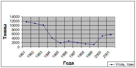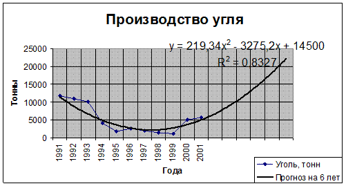 из-за рубежа. Таким образом, даже поддерживая все имеющиеся связи ОАО “ Моломский ЛХЗ” может позволить себе производить еще практически в 4 раза больше продукции. Годовой экономический эффект от полной загрузки имеющихся производственных мощностей по углю равен: Эг = 28000 *0,8 * 1750 = 39200000 рублей Таким образом, ОАО “ Моломский ЛХЗ” может получить дополнительно 39200000 рублей, при условии, что имеющиеся производственные мощности будут загружены на 100%. Рисунок 3.4 – Долгосрочный тренд производства угля