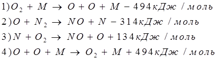Так же была разработана цепная схема окисления азота, в которой активную роль играют свободные атомы кислорода и азота :