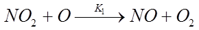 Так же не исключены и другие реакции разложения NO2. Образование NO начинается на расстоянии 1 мм от видимого фронта пламени и достигает максимума во фронте пламени. Отношение NO2/NO уменьшается с повышением температуры. Разложение NO2происходит за период = 4*10^-3 с на отрезке длинной 1 мм от начальной границы видимого фронта пламени. Зона разложения предпламенной NO2во фронте пламени совпадает с зоной образования «быстрых» NO, т.е зоной интенсивного нарастания концентраций оксида азота. Эффект разложения NO2в факеле известен и начинает использовать с целью очистки газов, содержащих высокие концентрации NO2(отходящие газы химической и других отраслей промышленности). Процесс доокисления NO в NO2в пламенах молекулярным кислородом имеет высокую энергию активации реакций и большое время реагирования, поэтому существенных количеств NO2он дать не может. Из двух наиболее вероятных окислителей NO в NO2(атомарный кислород и пероксидный радикал - HO2) практически значение имеет лишь НО2. Доокисление NO в NO2 происходит за счёт реакции с пероксидным радикалом и имеет место при сильном охлаждении пламен избыточным воздухом и водоохлаждаемыми поверхностями нагрева :