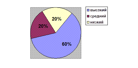 Рис. 8. Диаграмма уровней агрессивности детей (в %) по методике «Несуществующее животное» после проведения коррекционной работы. Сравнительный анализ результатов диагностического и контрольного этапов эксперимента показал, что в данной группе уровень агрессивности после проведения коррекционных занятий значительно снизился. Результаты обследования детей по тесту «Дом- дерево- человек». Качественный анализ рисунков детей показал снижение агрессивного настроения в рисунках. Так у восьми детей в рисунке человека исчезла прорисовка зубов и ноздрей, у трех детей в рисунках человека пальцы стали короче. Диагностические результаты рисунков приведены в Приложении 7. Количественный анализ рисунков показал, что уровень агрессивности детей следующий: ─ высокий – 7 детей; ─ средний – 5 ребенка; ─ низкий – 8 детей.