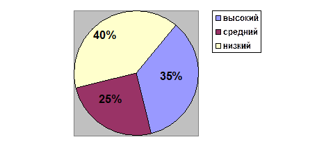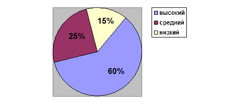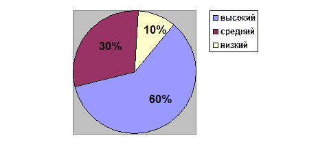 Рис. 9. Диаграмма уровней агрессивности детей (в %) по рисуночной методике «Дом-дерево-человек после проведения коррекционной работы Сравнительный анализ уровней агрессивности по методике «Дом-дерево-человек» по результатам диагностического и контрольного этапов показал, что уровень агрессивности детей после проведения коррекционной работы стал значительно ниже. Количественный анализ суммы баллов уровня агрессивности по двум рисуночным методикам поле проведения коррекционной работы следующий: ─ высокий – 6 детей; ─ средний – 6 детей; ─ низкий – 8 детей.