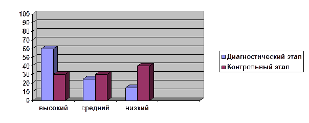 Рис. 5. Диаграмма уровней агрессивности детей (в %) по результатам двух рисуночных тестов (диагностический этап) Анализ результатов по двум рисуночным методикам показывает, что уровень агрессивности детей в данной группе достаточно высокий. Это дает основание говорить о том, что данная группа детей для проведения опытно-экспериментальной работы подобрана правильно. Общий вывод по диагностическому этапу исследования: Проведение диагностических заданий (наблюдения, анкетирование, рисуночные методики) и полученные результаты показали, что только 40 % детей данной группы имеют средний и низкий уровень агрессивности, а 60 % детей - высокий. Одной из важных причин проявления агрессивности в поведении данных детей могут быть неблагополучные отношения в семье. Полученные результаты диагностики говорят о серьезной необходимости проведения с детьми данной группы специальной коррекционной работы по снижению уровня агрессивности. 2. Коррекционный этап опытно-экспериментальной работы Коррекционный этап опытно-экспериментальной работы проводился нами со всеми детьми данной группы. Результаты диагностики и сделанные на ее основе выводы были учтены при разработке содержания занятий коррекционного этапа эксперимента. Цель коррекционного этапа: с помощью технологии игротерапии снизить уровень агрессивного поведения детей. Основные задачи этапа: ─ формирование социального доверия; ─ развитие социальной активности детей; ─ развитие коммуникативных навыков; ─ формирование адекватной самооценки детей; ─ снижение проявления агрессивности в поведении. Средства коррекции: детская игра, элементы психогимнастики, специальные приемы неигрового типа. Направленные на повышение сплоченности группы. Развитие навыков общения, способности к эмоциональной децентрации (разотождествлению себя с каким-либо негативным состоянием). Коррекционные занятия проводились нами совместно с психологом МДОУ №22 «Калинка». Всего нами было проведено 12 занятий – по 2 занятия на каждой неделе. Общая длительность коррекционного этапа - 1,5 месяца. Содержание всех занятий коррекционного этапа по технологии социальной коррекции агрессивного поведения детей с помощью игротерапии приведено нами в Приложении 8. Структура каждого коррекционного занятия Каждое занятие состоит из ряда этюдов и игр. Они коротки, разнообразны, доступны детям по содержанию. Так как основная цель занятий – коррекция агрессивного поведения и предупреждение эмоциональных расстройств, то основной акцент в занятиях сделан на развитие произвольности, навыков бесконфликтного взаимодействия и на приобретение навыков в саморасслаблении. Занятия строятся, по определенной схеме и состоят из этапов. Каждый этап может решать не одну, а несколько совершенно самостоятельных задач, по-своему важных для коррекции агрессивного поведения. Временные характеристики занятий зависят от возможностей ведущего и состояния группы детей. 1-й этап. Разминка. Занятие начинается с общей разминки. Ее задача: сбросить инертность физического и психического самочувствия, поднять мышечный тонус, разогреть внимание и интерес ребенка к совместному занятию, настроить детей на активную работу и контакт друг с другом. Для решения этой задачи выполняется несколько упражнений-игр на внимание или подвижная иг