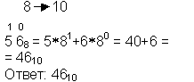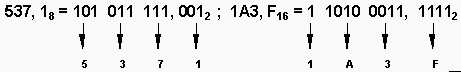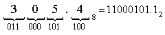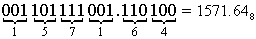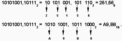 Чтобы перевести число из двоичной системы в восьмеричную или шестнадцатеричную, его нужно разбить влево и вправо от запятой на триады (для восьмеричной) или тетрады (для шестнадцатеричной) и каждую такую группу заменить соответствующей восьмеричной (шестнадцатеричной) цифрой. Например: